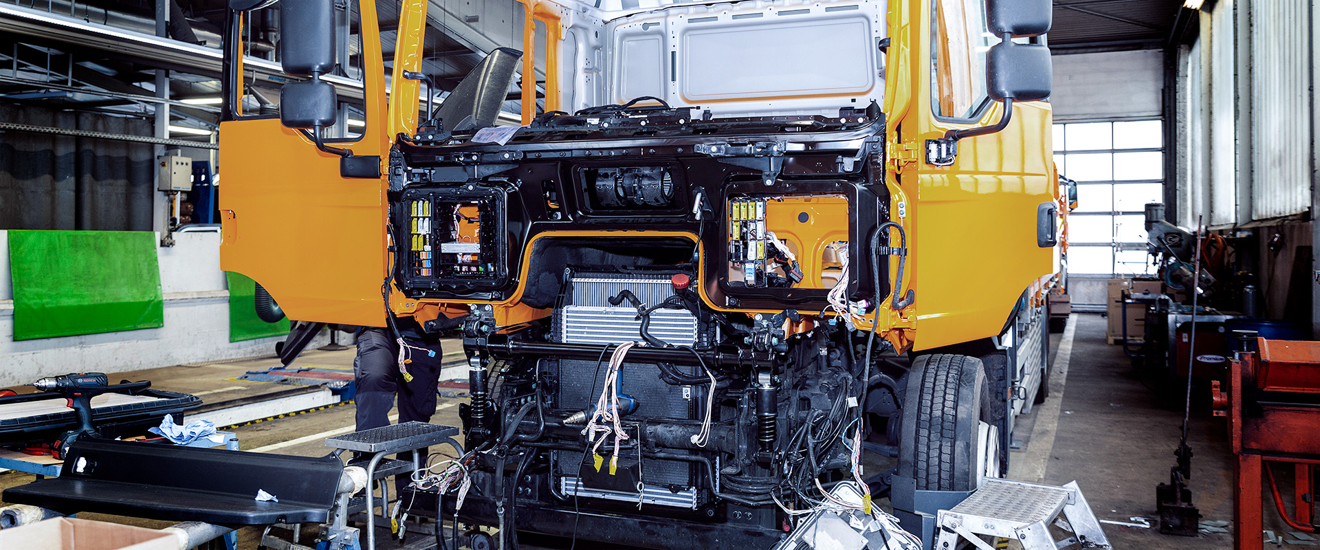 Dellen, Verformungen, Lackschäden oder große Schäden an Fahrzeugteilen werden nach Herstellervorgaben fachgerecht instandgesetzt. Dazu sorgen wir für ein perfektes Finish: In unserer Lackiererei übernehmen wir die professionelle LKW Lackierung, um Oberflächen dauerhaft zu schützen und ein optisch einwandfreies Ergebnis zu erzielen. Auch Glasarbeiten wie Scheibenreparaturen und -tausch werden direkt im Betrieb durchgeführt, sodass das Fahrzeug vollständig und zeitsparend instandgesetzt werden kann.